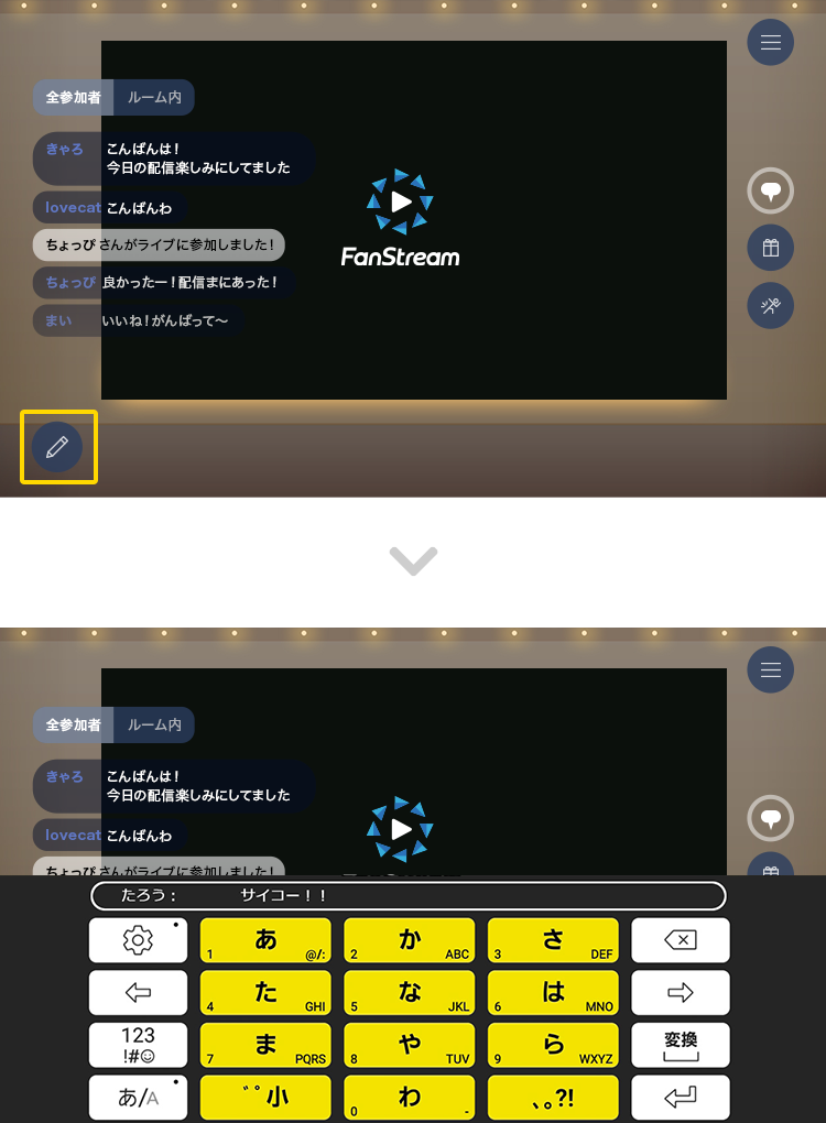コメント下のペンアイコンを押すとフォームとキーボードが表示されコメント入力・投稿ができます